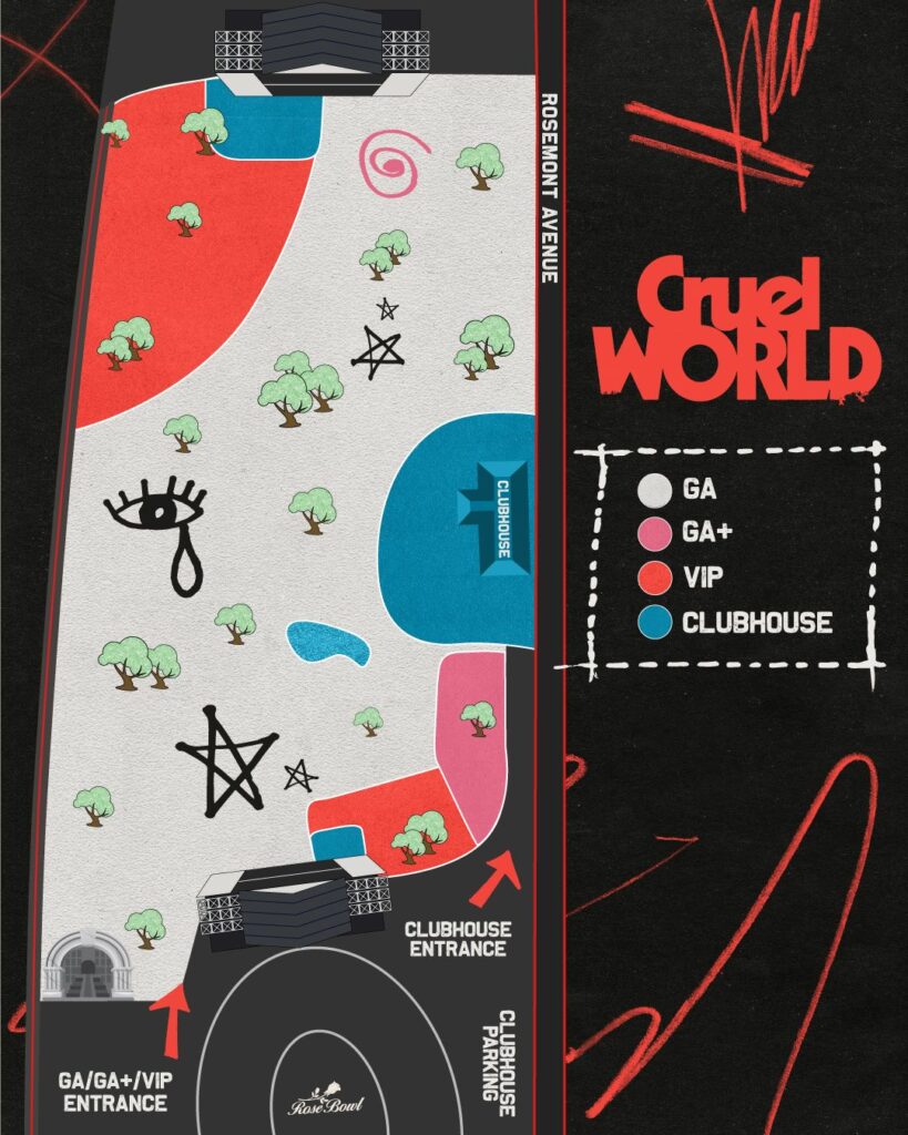 Saving your spot at Cruel World is starting at $209 + fees! This gets you a GA pass, giving you access to roam all GA areas – food, bevies, and all stages included.