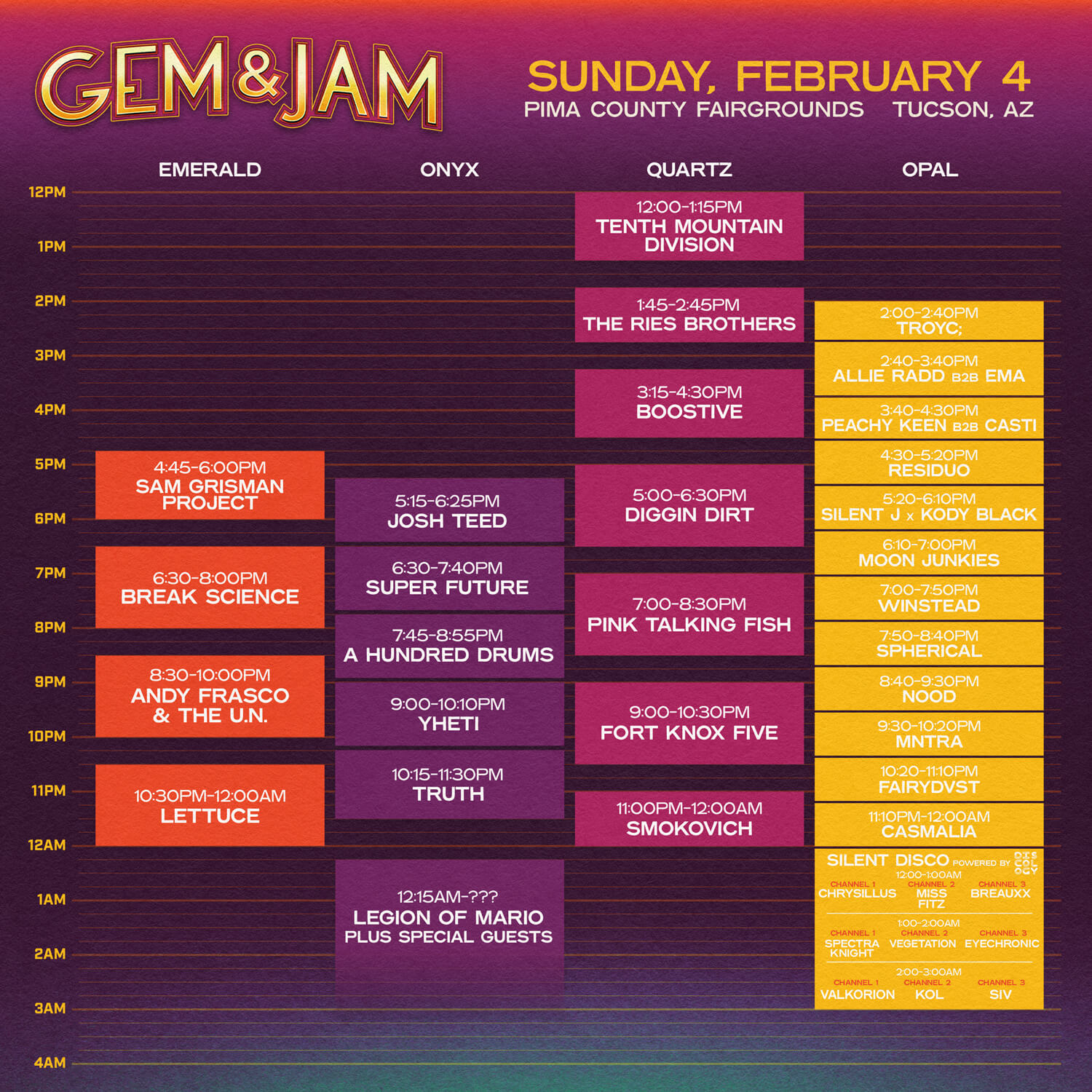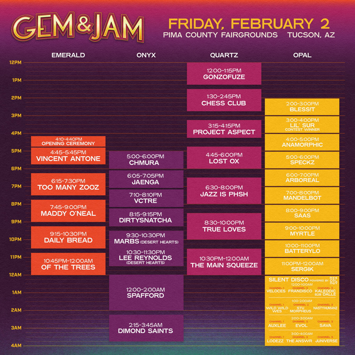 Check out the day-by-day schedule for the Gem and Jam Festival 2024, featuring the full lineup across the Emerald, Onyx, Quartz, and Opal stages.