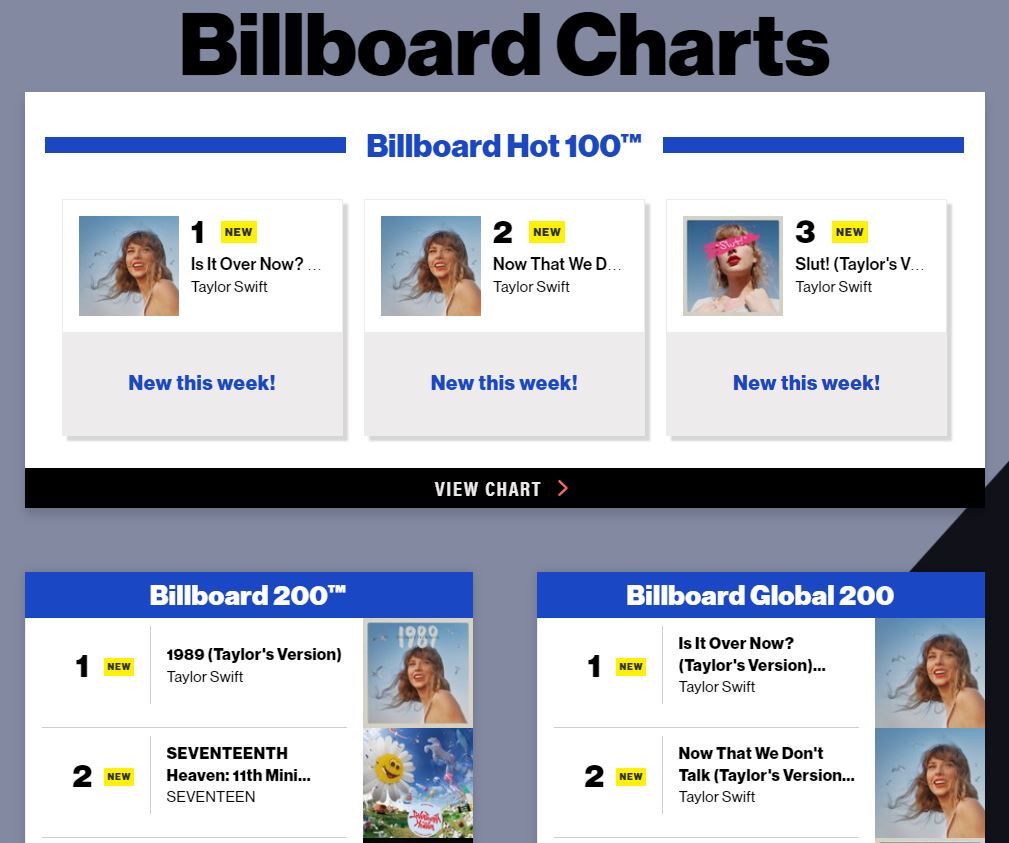 Прво место на песните од одново снимениот и реобјавен албум „1989“, со назив „1989 (Taylor’s Vesion)“. Албумот дебитира на првото место на билбордовата листа 200 (Billboard 200)
